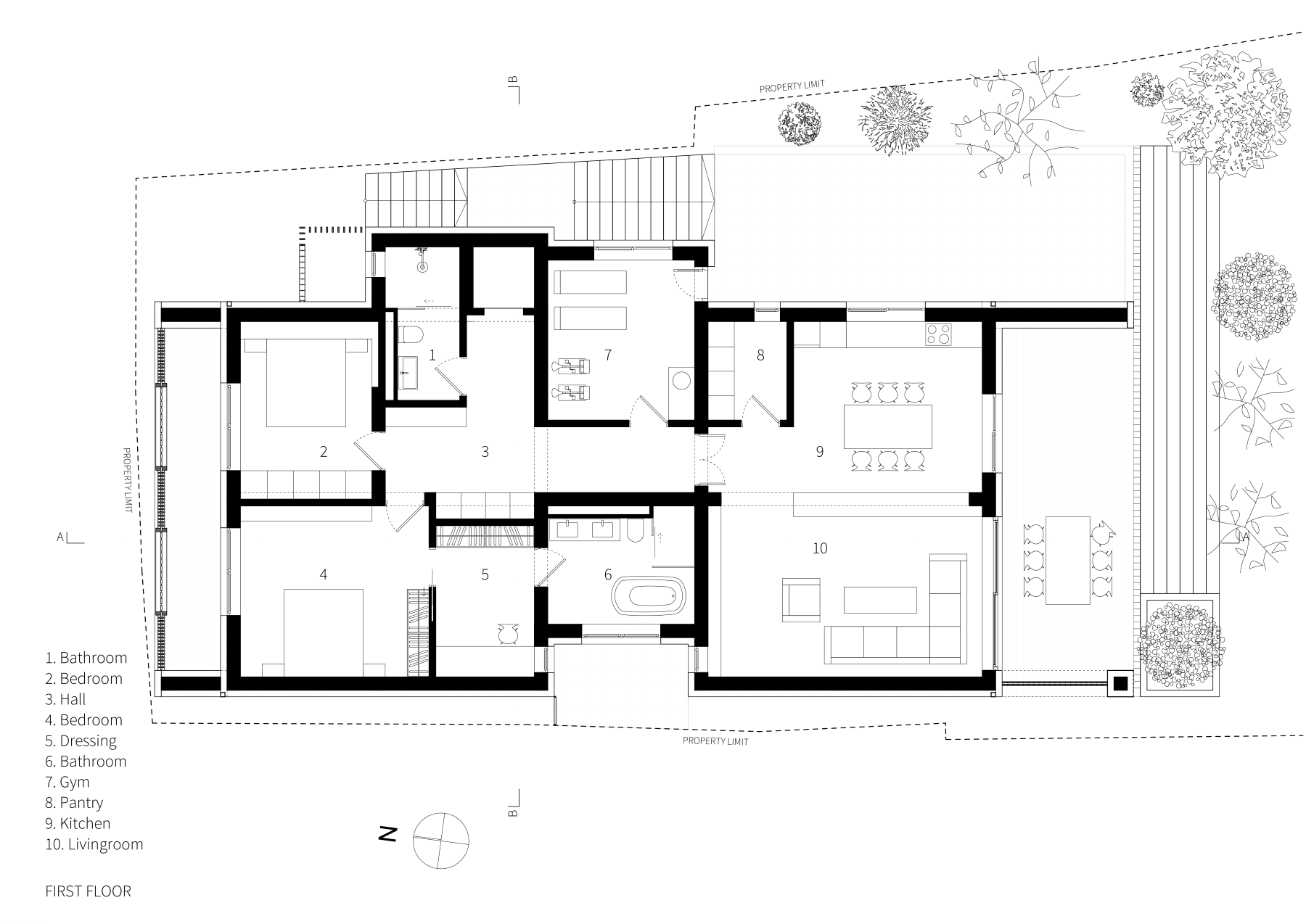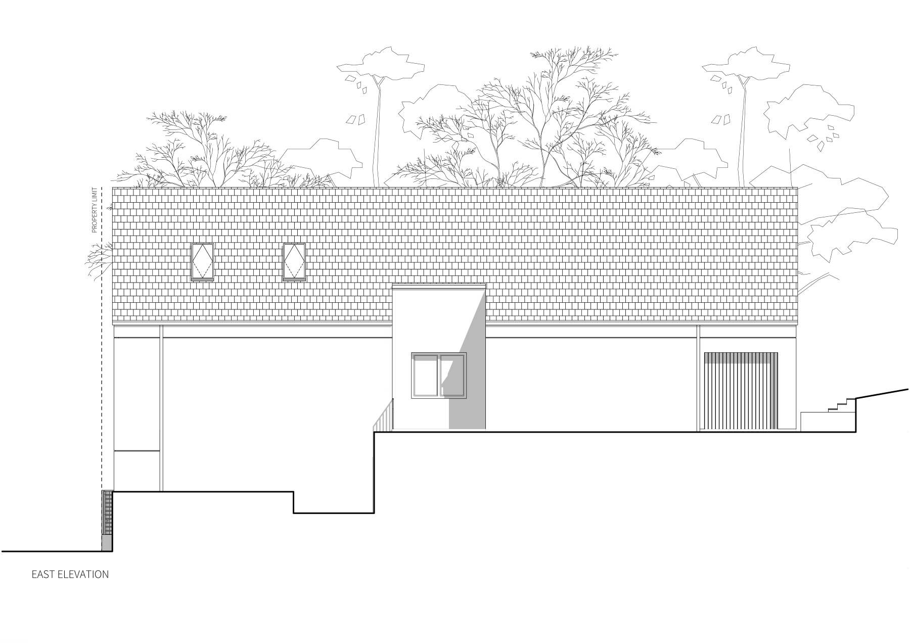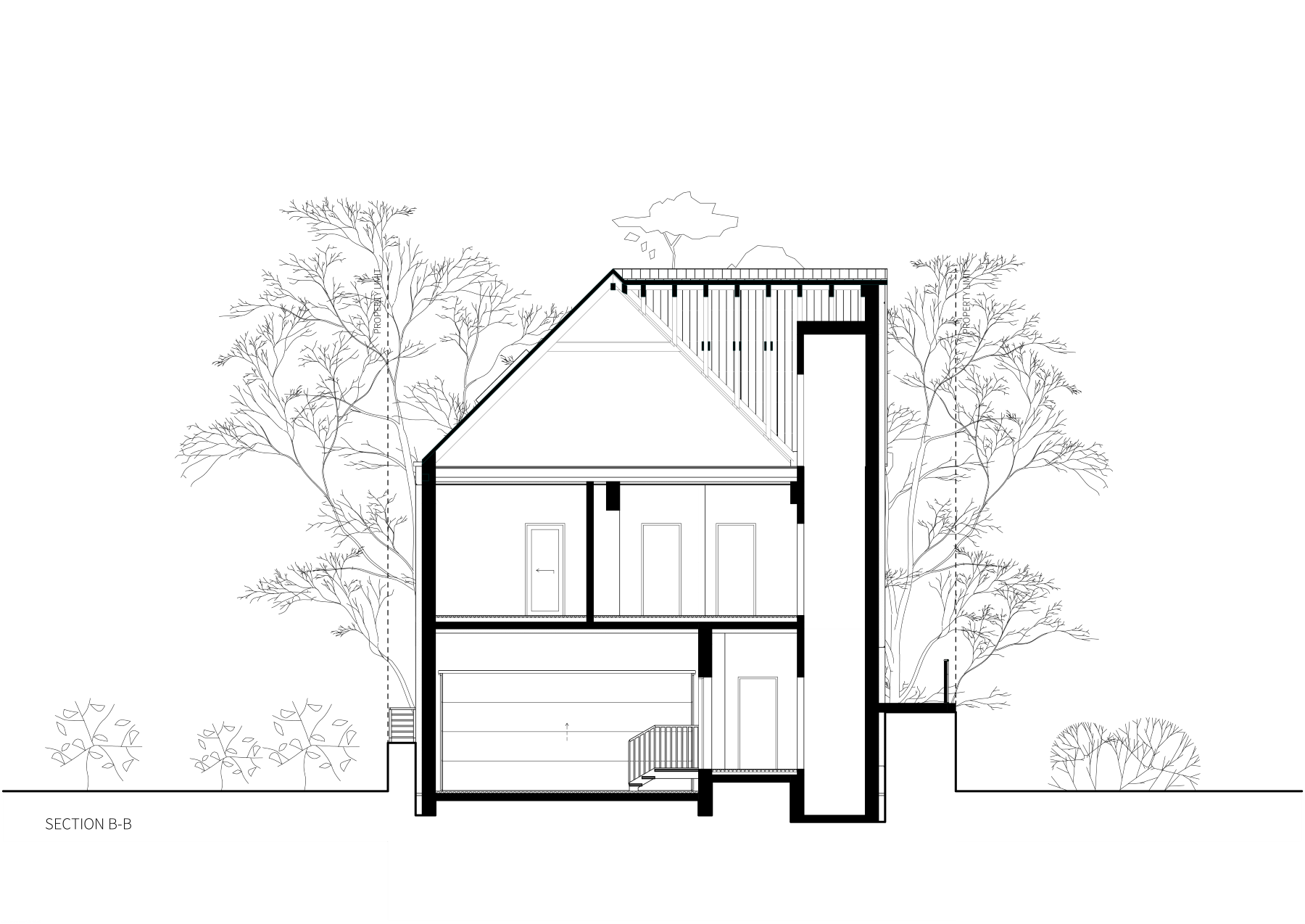The house is carefully sited within its urban plot, with a modest front setback and landscaped buffers providing both privacy and a soft transition from street to interior. The restrained use of hardscaping and native planting creates a serene, low-maintenance outdoor environment.