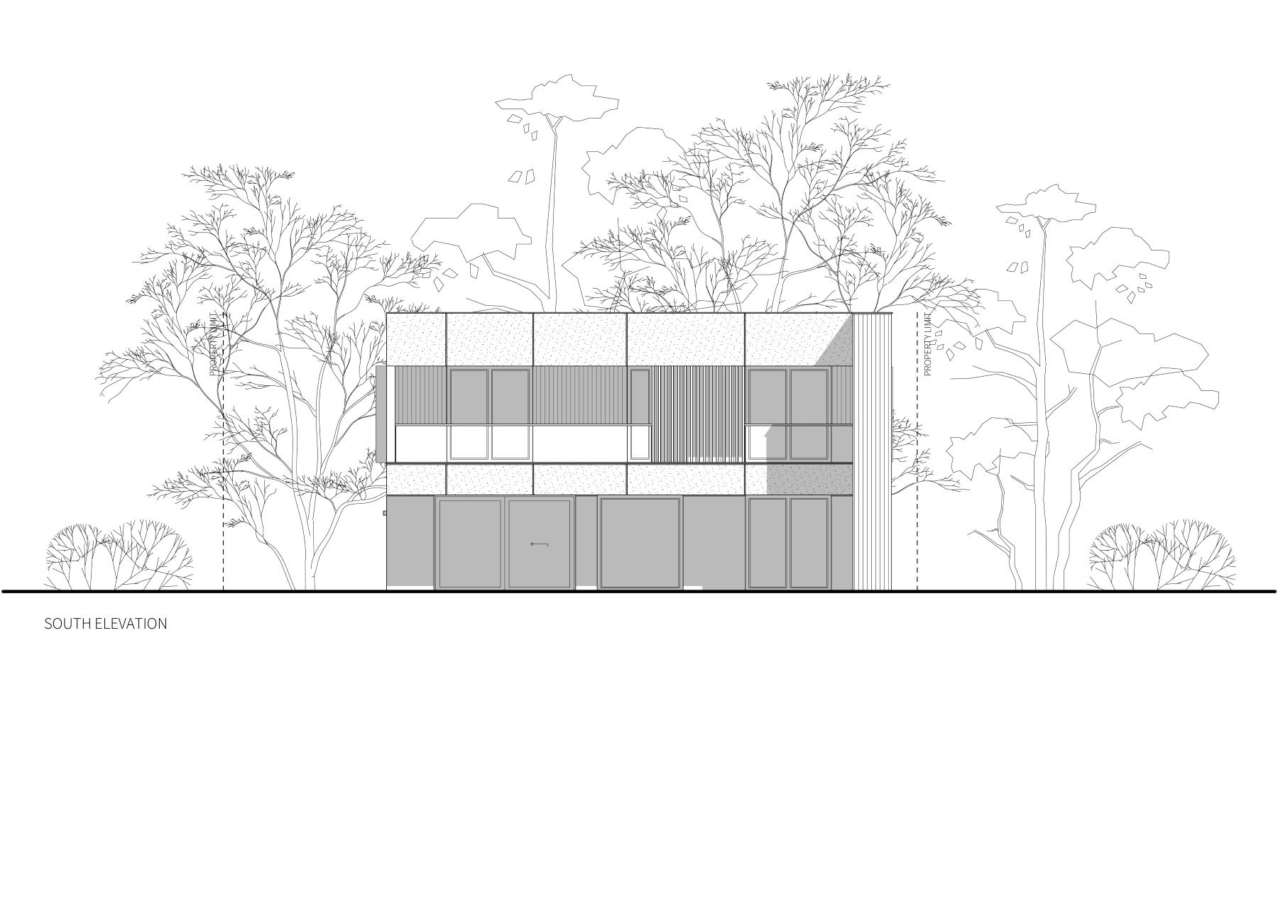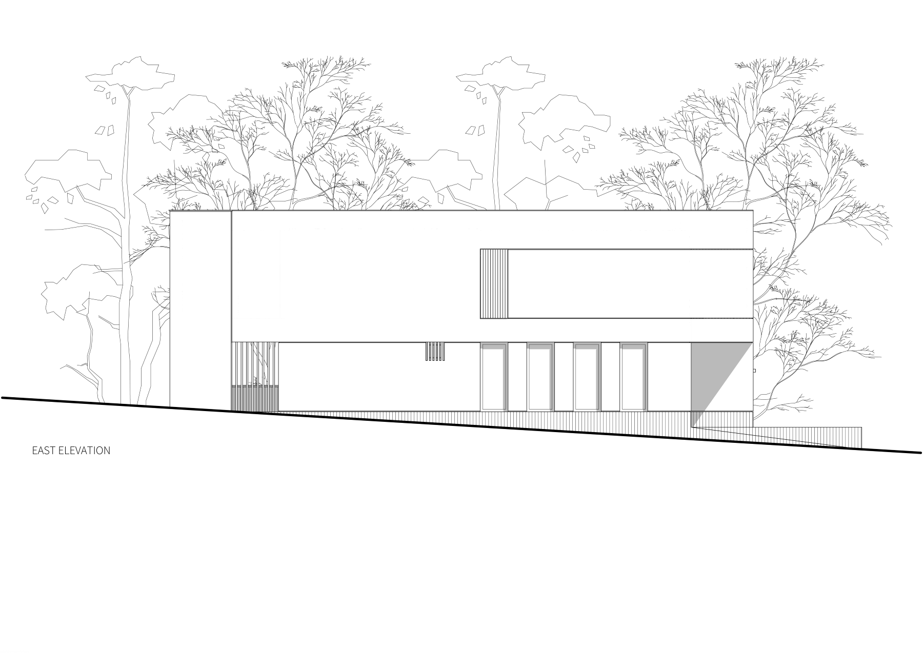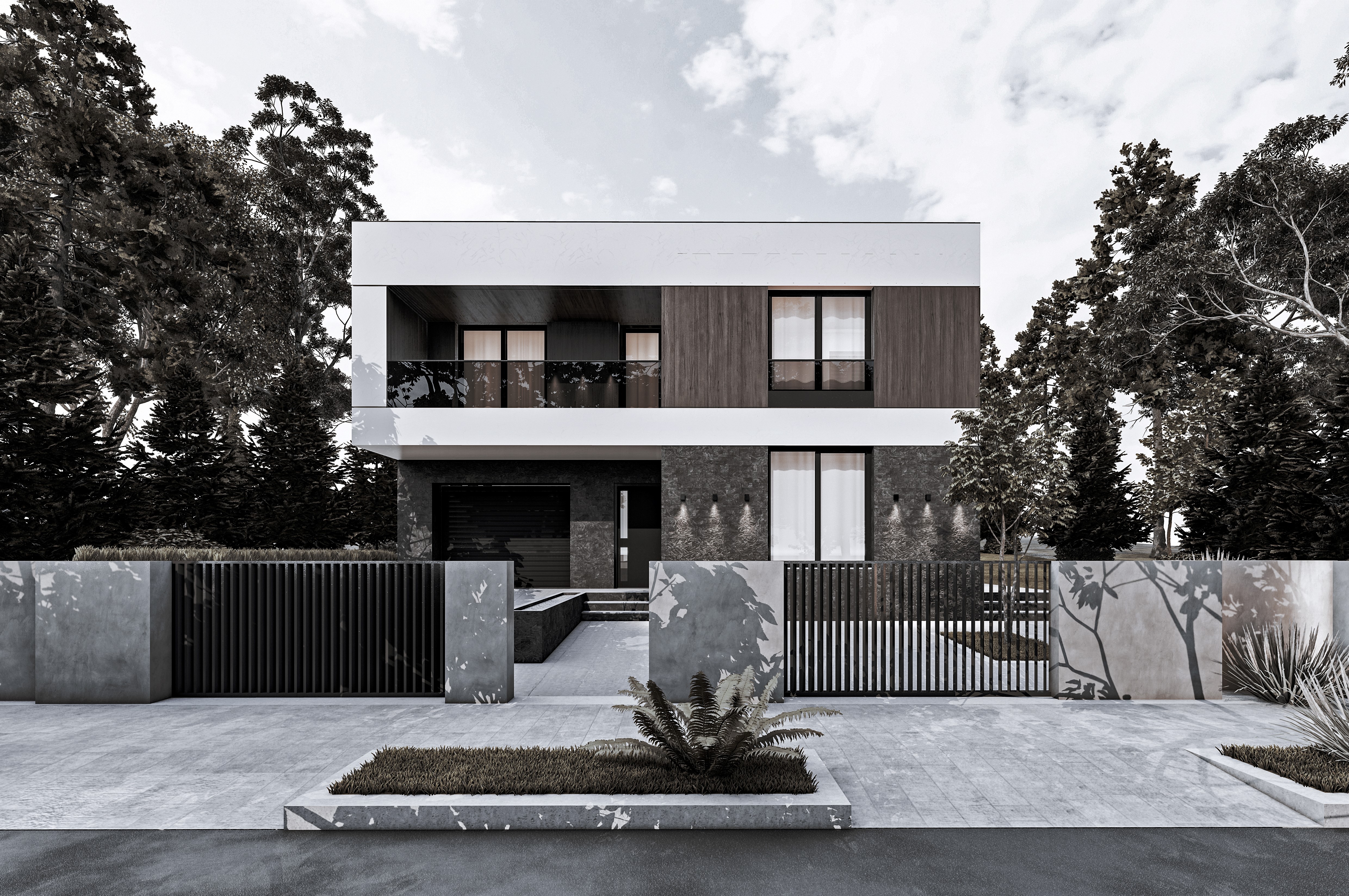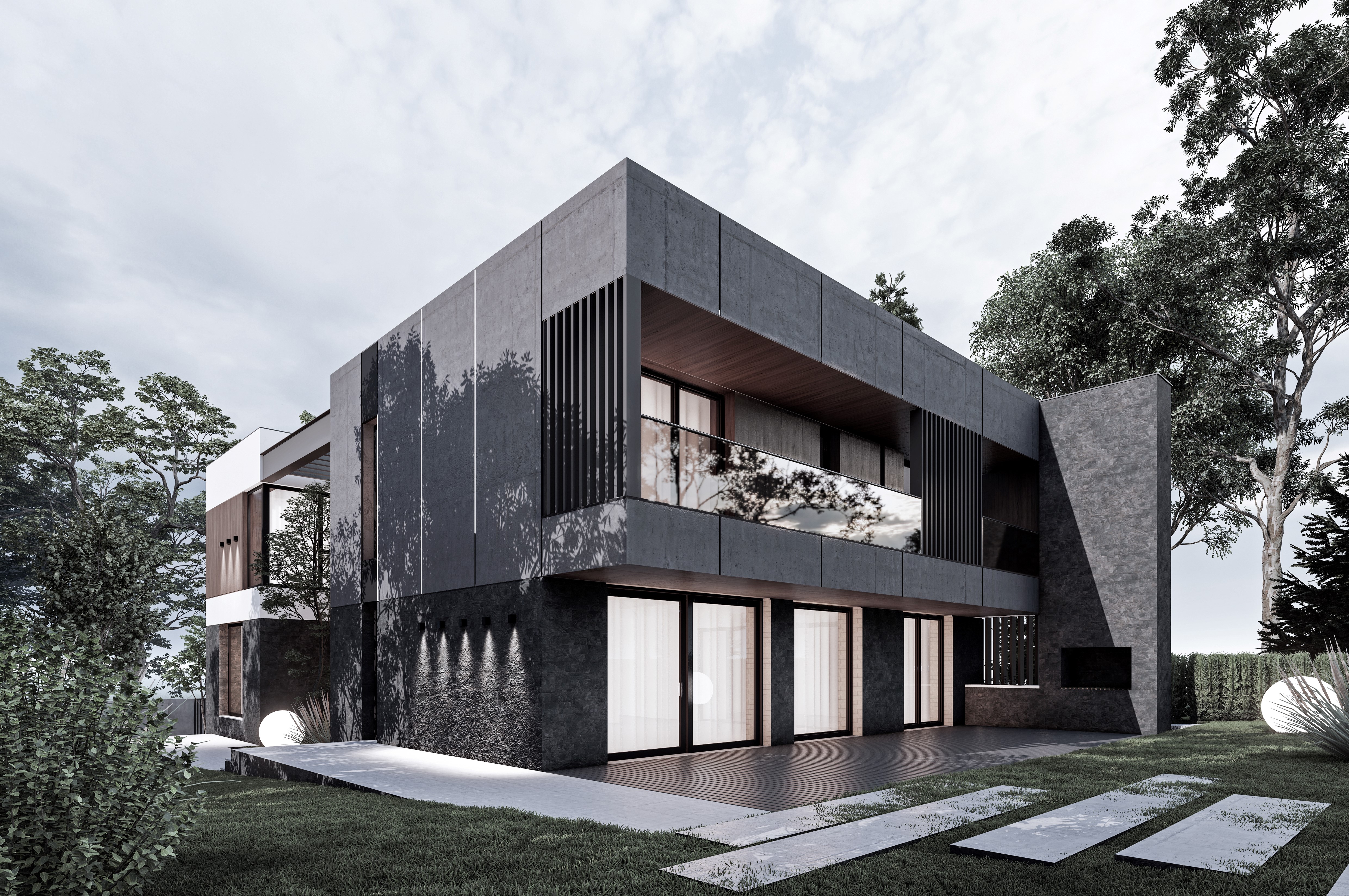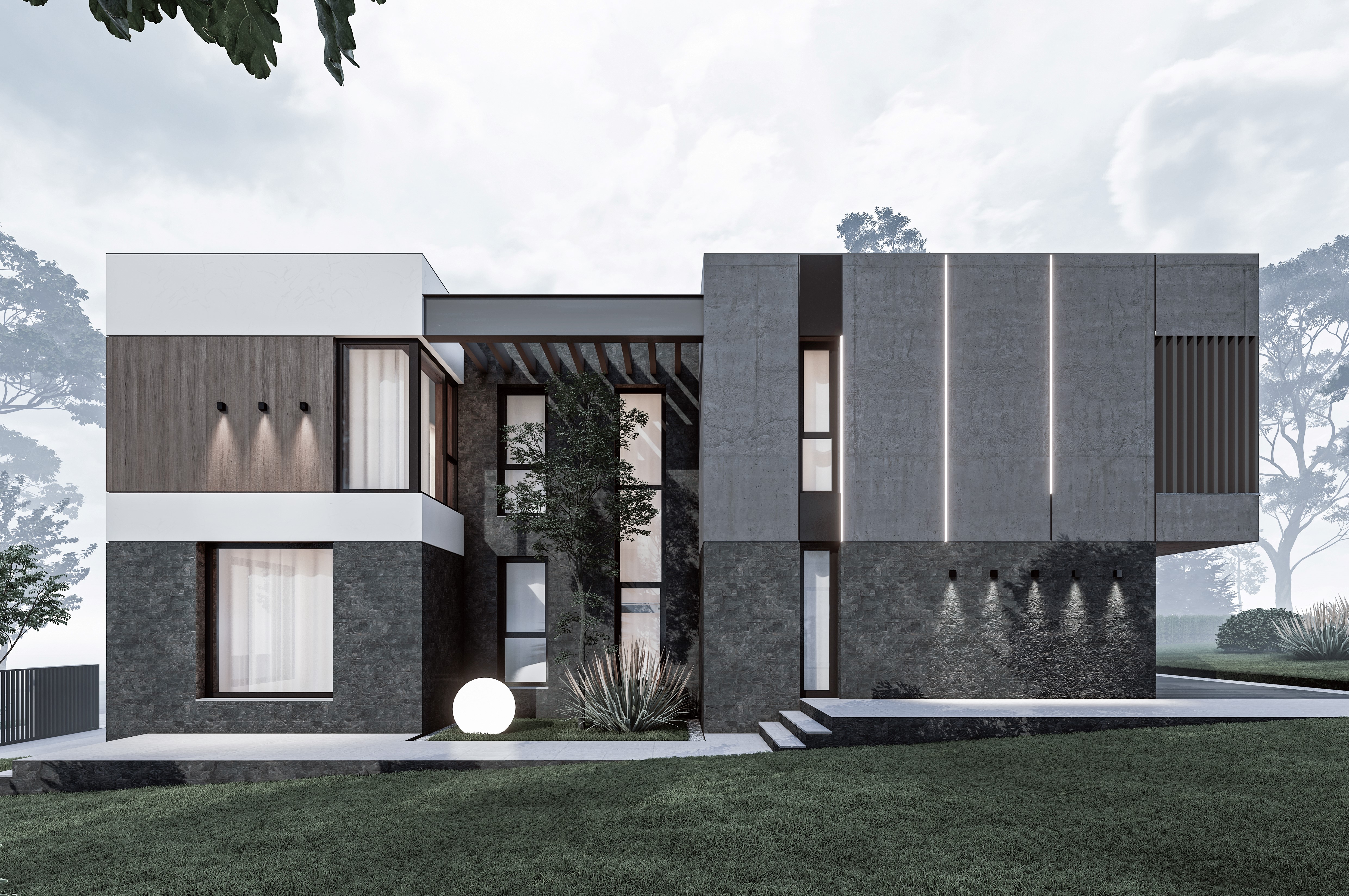 The house is conceived as a monolithic volume, defined by sharp edges and a predominantly horizontal rhythm. A restrained palette of dark textured concrete, natural wood, and reflective glass amplifies the sculptural quality of the building, while also anchoring it visually within its forested environment. The use of vertical slats and recessed elements on the façade introduces rhythm and privacy while softening the massing. Strategic openings and cantilevered overhangs enhance the architectural tension, creating dynamic relationships between solid and void, light and shadow.